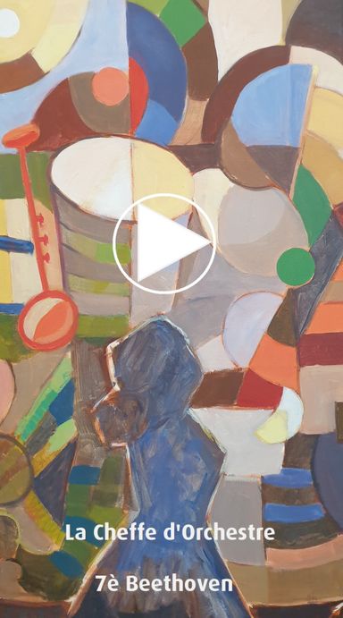 Cette peinture de grand format représente une cheffe et son orchestre jouant le 7e Symphonie de Beethoven. La musique envahit toute la salle de concert et devient un espace coloré en mouvement.